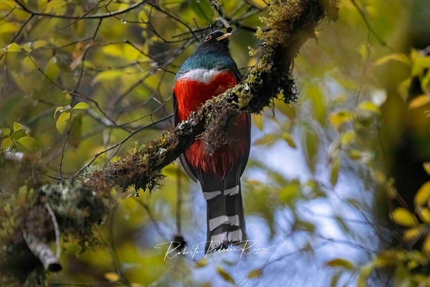 Recién me encontré esta joya, un habitante típico de bosques templados y de niebla de México y la Sierra Gorda. El Trogón de Montaña depende al 100% de los bosques, primo de los fantásticos Quetzales, y aunque vistosos no son fáciles de fotografiar, escuchándose más sus vocalizaciones en la presente temporada de anidación. Bien que saben los machos de su vientre rojo y lo ocultan a conciencia, dando casi siempre la espalda.